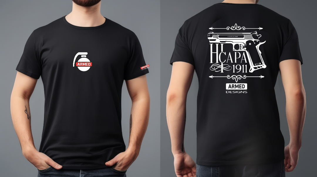 Comfortable cotton t-shirt with ‘Hi Capa 1911″ Â Airsoft design. Printed on heavyweight 100% cotton T-shirt.