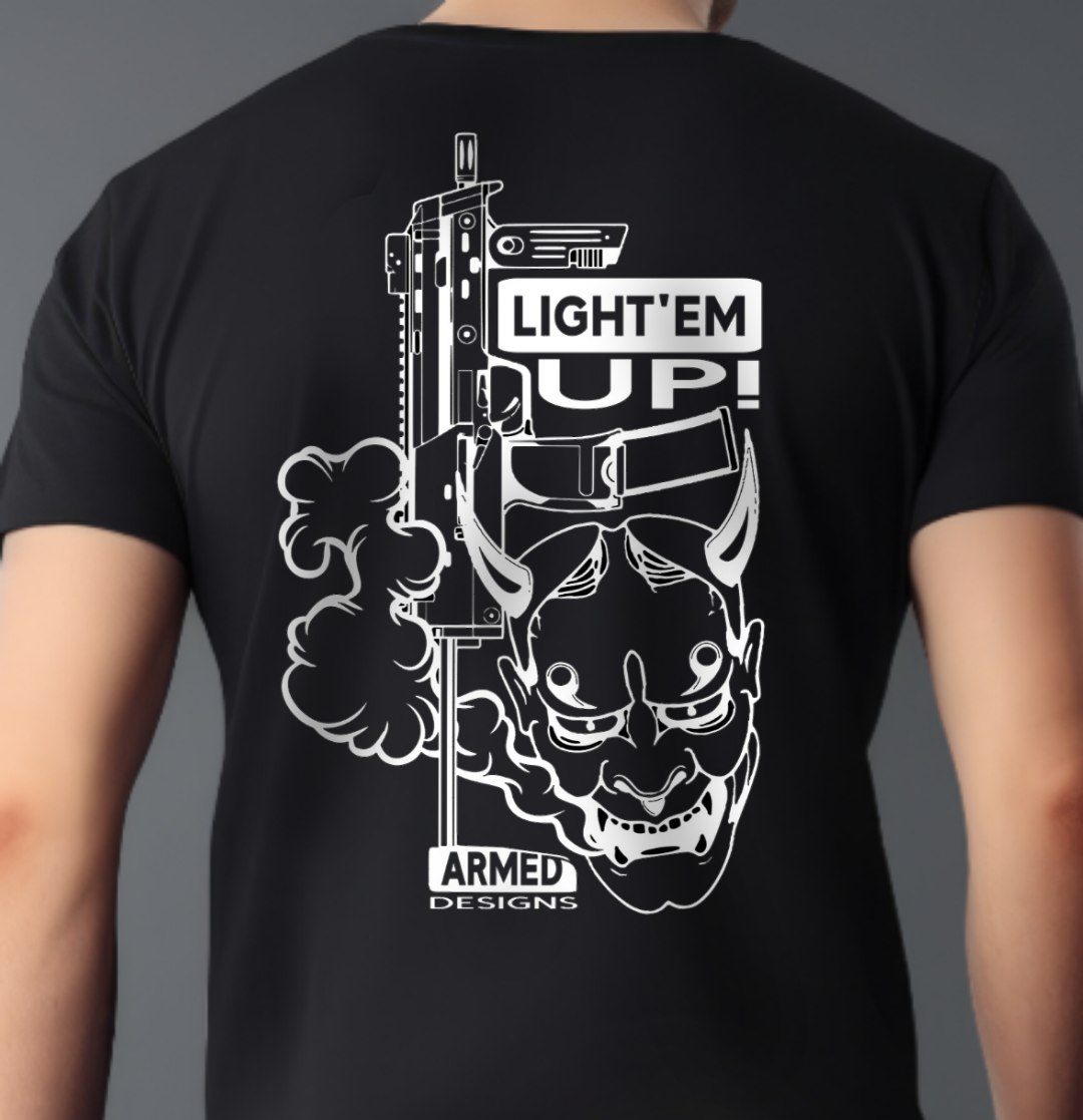 Comfortable cotton t-shirt with ‘Light’em Up” Airsoft design. Printed on heavyweight 100% cotton T-shirt.
